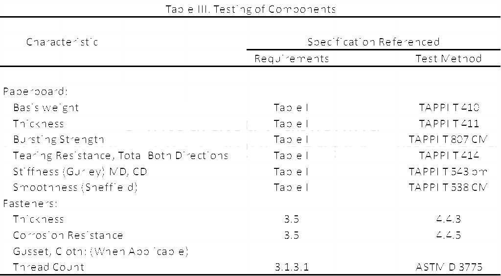4.2 Component Testing. Each lot of paperboard, and each lot of fasteners, and each lot of cloth gusset material, used in the manufacture of file folders shall be tested for the characteristics and in accordance with the referenced test methods in Table III.